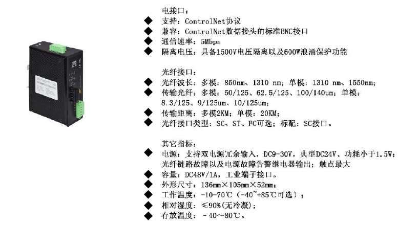 支持:ControlNet協(xié)議 兼容:ControlNet數(shù)據(jù)接頭的標(biāo)準(zhǔn)BNC接口 通信速率:5Mbps 隔離電壓:具備1500V電壓隔離以及600W浪涌保護(hù)功能 |