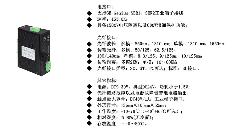 支持GE Genius SER1、SER2工業(yè)端子接線 速率:153.6K; 具備1500V電壓隔離以及600W浪涌保護功能: