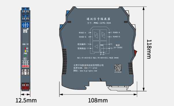 PHG-11TC-33*通訊信號輸入信號隔離器,可實現(xiàn)RS-485半雙工數(shù)字信號在控制室和現(xiàn)場的雙向通信,電路為現(xiàn)場儀表提供配電電源(如下表所示)。
