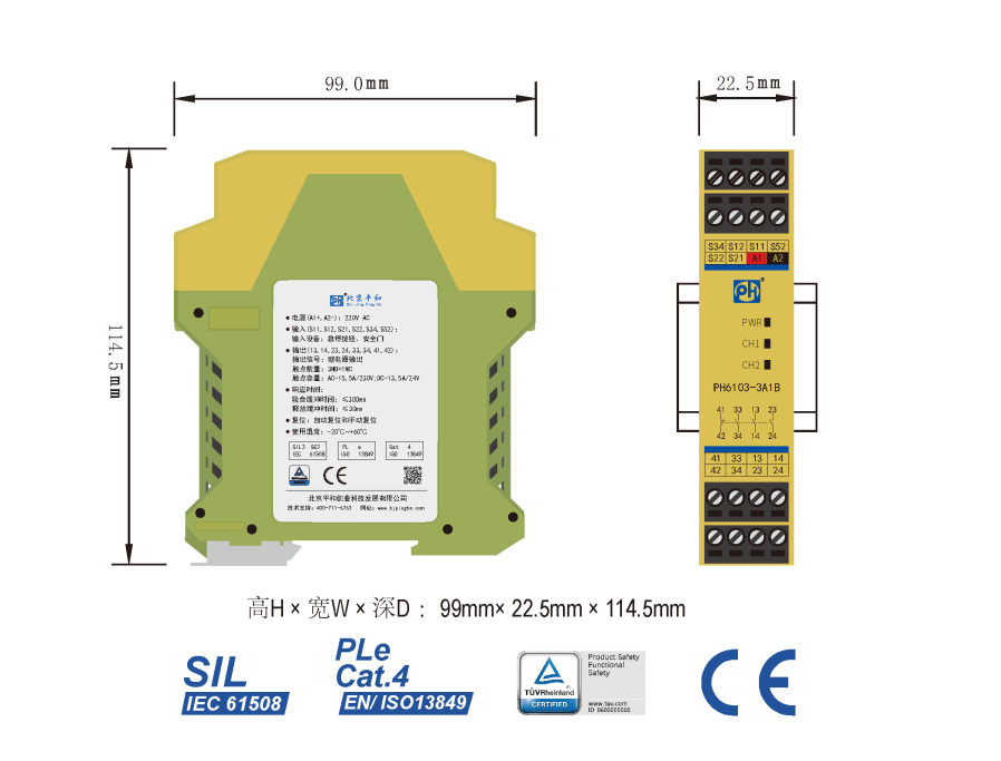 PH6101-3A1B是一款安全繼電器控制模塊,適用于急停按鈕、安全門控制開關輸入,具有3路常開(NO)安全輸出觸點和1路常閉(NC)輔助輸出觸點的安全繼電器。它支持單、雙通道操作,手動或自動復位,并具有通道間短路監(jiān)控功能。