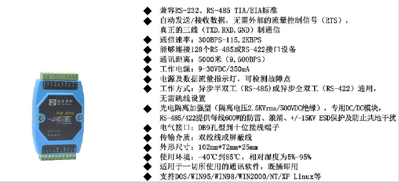 | 工作方式 | 異步半雙工(RS-485)或異步全雙工(RS-422)通用,無需跳線設(shè)置 |