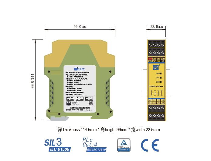 PH6201-2A2B-P是一款安全繼電器控制模塊,適用于PNP型安全光幕輸入,具有2路常開(NO)安全輸出觸點(diǎn)和2路常閉(NC)輔助輸出觸點(diǎn)的安全繼電器。它支持單、雙通道操作,手動或自動復(fù)位,并具有通道間短路監(jiān)控功能。